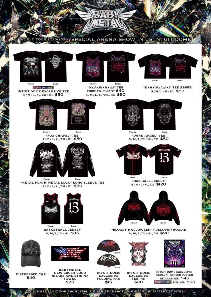 “BABYMETAL WORLD TOUR 2025-2026 SPECIAL ARENA SHOW IN US INTUIT DOME” Merchandise Announcementhttps://t.co/PKfYIkRlI5#BABYMETAL #BABYMETALWORLDTOUR20252026 pic.twitter.com/6FCEDboVh7