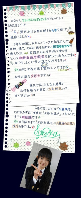 時は流れ、2011年の春。伝説によると、さくら学院はグループ初のフルアルバム『さくら学院 2010年年度:Message』の撮影に、お気に入りの私物を持参するよう求められたという。どういうわけか、すぅは表向きはヘラを2本選んだようで(2枚目の写真参照)、さくら学院ファンはそれを彼女の広島への惜しみない愛の表れだと解釈した。特に、彼女はその後2度もお好み焼きについて触れている。1度目はオンライン日記(2011年4月15日)で、彼女は(唐突に)自分のお好み焼きのレシピが一番美味しいと長々と書き込んでいた(3枚目の写真参照)。2度目は、アルバムリリース(2011年4月27日)に合わせて、MONO Comme Caで展示された彼女のプロフィールカードに「特技は広島風お好み焼き(太字で強調)、歌、ダンスです」(4枚目の写真参照)という一文が掲載されていたのだ。