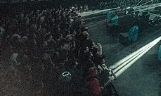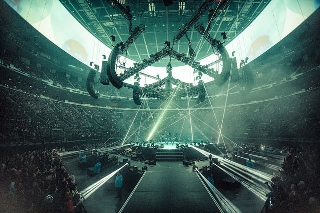 SOLD OUTとなったIntuit Domeの会場内には、『METAL FORTH』のアルバムジャケットのデザインにもなっている菱形のブラックホールを形どったセンターステージが設置され、エンドステージ側にはブラックホールが浮かび上がる巨大なMETAL FORTHの空間が広がっていた。さらにはステージおよび会場全体を360度囲むようなHALOと呼ばれるリング状の巨大なLEDスクリーンが天井から吊るされており、今回のスペシャルな公演に期待が高まる。