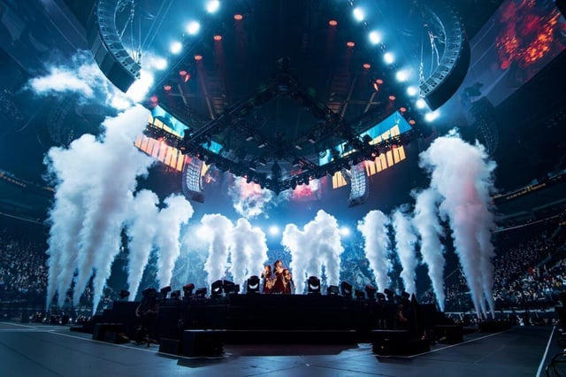彼らの円形ステージは独創的で、周囲にはレーザービーム、クライオジェット、そしてもちろん巨大なパイロキャノンが張り巡らされていました。このショーの特殊効果は他に類を見ないもので、私たちは待ちに待った夢のような世界にどっぷりと浸かることができました。照明装置が頭上を囲み、上部リングの周囲にはビデオスクリーンが張り巡らされ、万華鏡のようなアニメメタルグラフィックが曲に合わせて完璧に点滅しました。そして特殊効果が鳴り響くと?なんと、高さ4.5メートルを超える炎がバンドの周囲を炎の檻のように包み込み、氷のように冷たいクライオの煙が3人を包み込み、ショー全体に「この世のものとは思えない」雰囲気が漂いました。