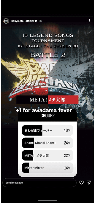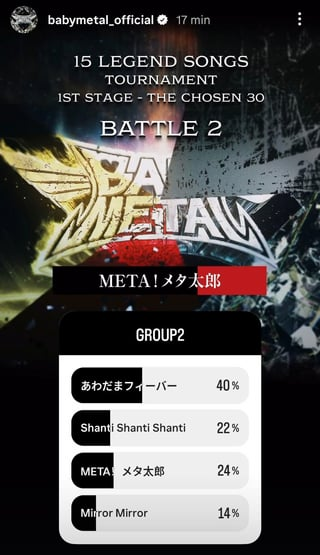 BABYMETAL15周年を記念して、ファンが選ぶ15曲が登場します。公式Instagramアカウントのストーリーで毎日投票できます。BABYMETAL10周年の時と同じように。