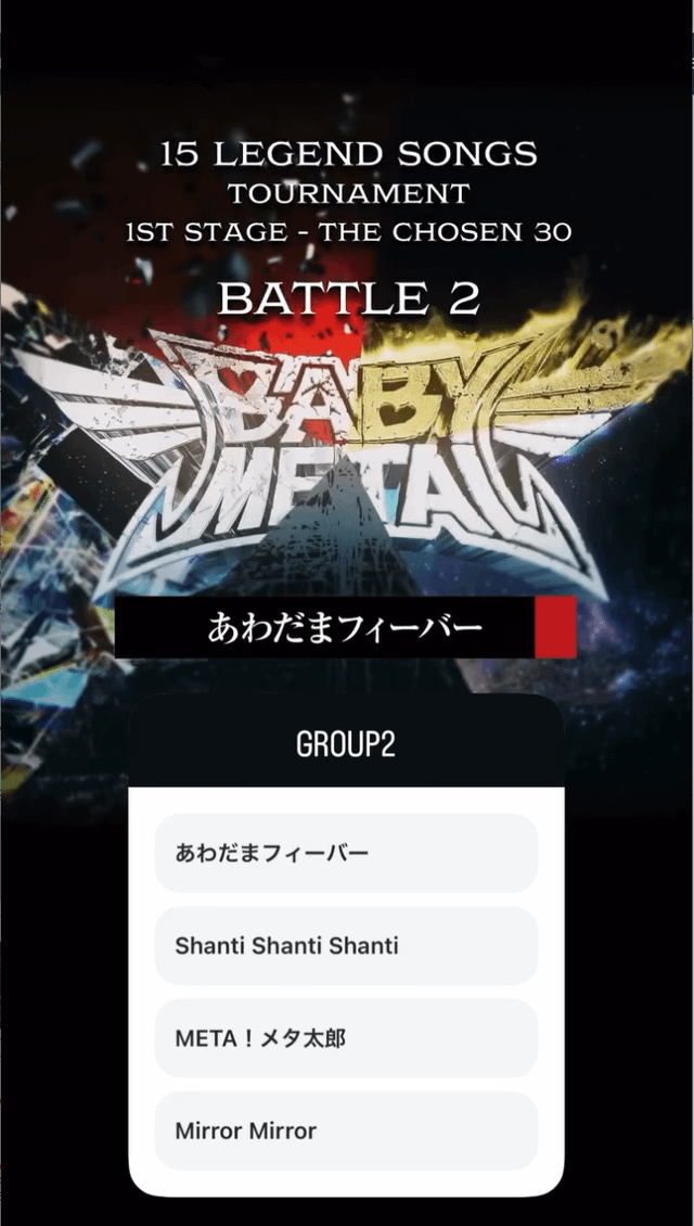 正直なところ、私はあわだまフィーバーかメタ太郎に投票したかったのですが、「Mirror Mirror」に投票しました。The Other Oneが好きで、絶対に勝てないだろうと分かっているからです。残念な投票でした。正直に言うと、「The Other One」の曲がそれぞれのラウンドで優勝するチャンスがあるのは、「Divine Attack」と「Monochrome」だけです。しかも、ギミチョコ、ヘドバンガー、空手などの人気曲と競わない限りです