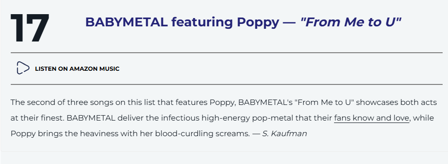 このリストでポピーがフィーチャーされている3曲のうち2曲目、BABYMETALの「From Me to U」は、両者の真骨頂と言えるでしょう。BABYMETALはファンに馴染み深く愛されている、中毒性のあるハイエナジーなポップメタルを披露し、ポピーは血も凍るような叫び声で重厚なサウンドを響かせます。— S. カウフマンhttps://consequence.net/list/best-metal-hard-rock-songs-2025/elder-liminality/