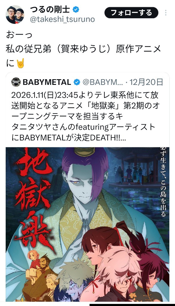 私の従兄弟(賀来ゆうじ)原作アニメに🤘 https://t.co/qBaGvyrNaL— つるの剛士 (@takeshi_tsuruno) December 27, 2025
