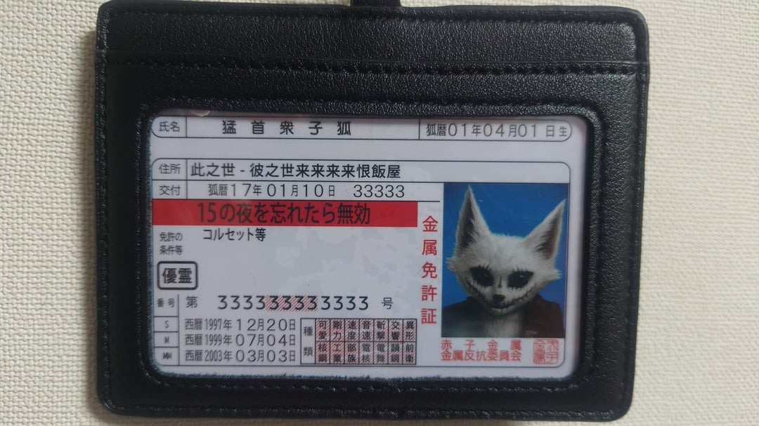 ビジュアルのハイライト: MV から再現されたディスプレイ キャビネット/輝き、2 つの特攻服バトル ジャケット (Twitter では非公式に「Song 3」と「Headbanger 15」と呼ばれています)、ぬいぐるみの名前が発音的には Mosh’sh Kogitsune であることが明らかになりました (ストラップ カード ホルダーに含まれる「メタル ライセンス」に記載されています)、2 つの異なるディスプレイ看板にある BM のサイン (投票ブースで Moa が好きな曲が選ばれなかったことを嘆いて「どうして!!」と叫んでいる手書きのメッセージ)。
