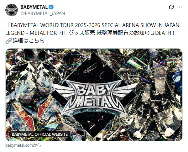 📌一部グッズに関しては、事後通販を行う予定がございます https://t.co/nXhzuC1yNP— BABYMETAL (@BABYMETAL_JAPAN) January 9, 2026