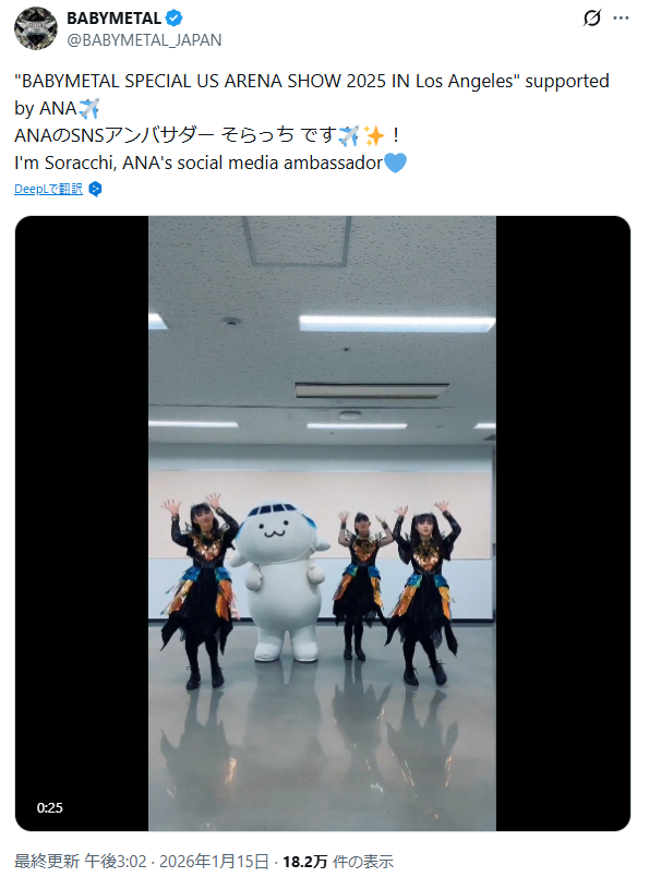 I’m Soracchi, ANA’s social media ambassador💙 pic.twitter.com/xzY8i8ec0n— BABYMETAL (@BABYMETAL_JAPAN) January 15, 2026