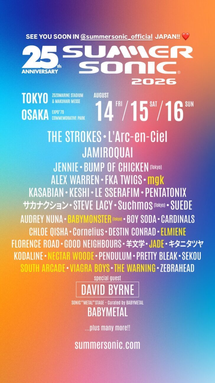 25周年にふさわしい豪華ラインナップが話題の”SUMMER SONIC 2026″。BUMP OF CHICKEN、BABYMETALの発表に続き第2弾追加アーティストが発表となった!