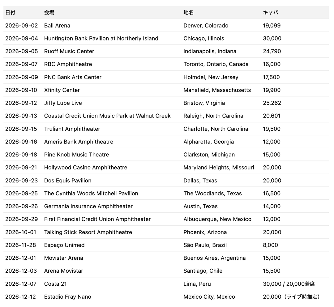 屋外の会場が多く、屋外の会場は芝生席込みのキャパだけど、それでもアリーナレベル。ゲストアクトは付けるんだろうけど、ヘッドラインショーでこの規模はさすがっす。 pic.twitter.com/ahhGPEvdjd— TERI (@_Terimetal) March 31, 2026