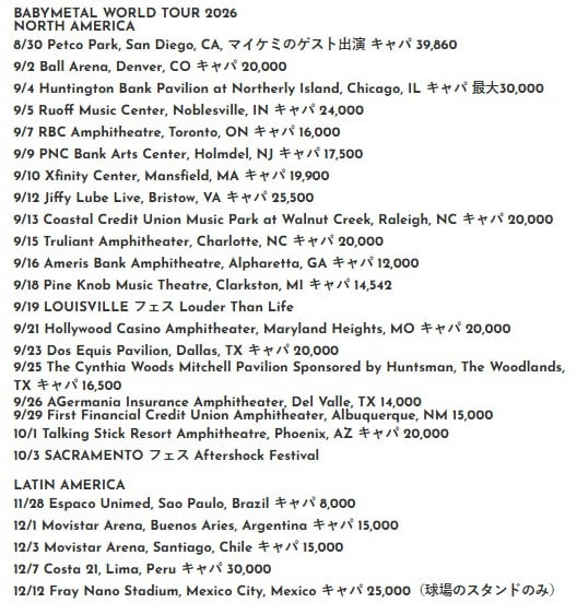 引用元:https://www.reddit.com/r/BABYMETAL/comments/1s8vtiy/venue_capacities_for_north_latin_american_venues/