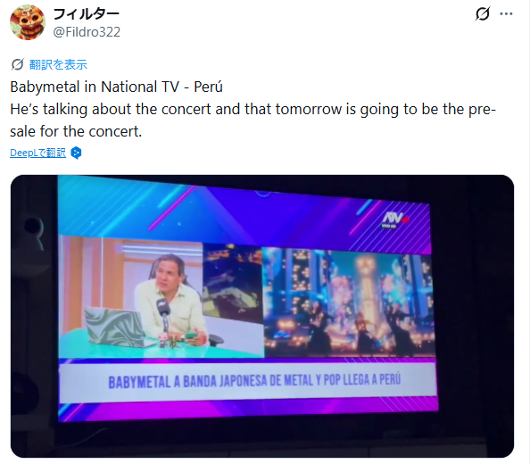 ペルーのテレビ局「ATV」のニュース番組(日本で例えるなら日テレやフジテレビ)で、BABYMETALのペルー・リマ公演が決定したことを報じられる